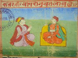 | Description / विवरण | A leaf of illustrated manuscript depicting two men in conversation. One of them sitting on a couch. This manuscript has 38 pages with 16 illustrations. |