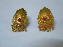 | Description / विवरण | It s a golden colour metallic ear-ring pair. It s a leaf shape. Red bead in centre. |