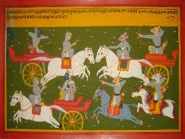 | Description / विवरण | Miniature painting based on Mahabharat - Vana parva depicting war scene between Pradyuman and demon king. At the lower part, Pradyuman is shown talking to his chariot driver. Behind them, two demon are shown shooting arrow on him. At the upper level, Pradyuman is shown shooting arrows on demon king who is also sitting on his chariot and replying him back. |