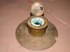 | Description / विवरण | This is an Inkpot having a small porcelain pot inside it slightly broken and detachable .It has a projected base, outward parallel to earth. It is having a circular lid over it which is attached with a latch. It has a slightly tarnished base. |