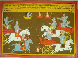 | Description / विवरण | Miniature painting based on Mahabharat - Vana parva depicting war between Pradyuman and demon Salva. Devtas are seeing the war from sky. |