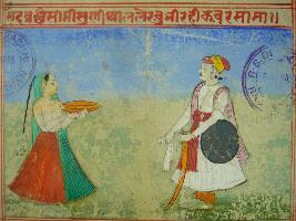 | Description / विवरण | A leaf of illustrated manuscript depicting a warrior talking to a female who is holding a basket on her hand. This manuscript has 38 pages with 16 illustration. |