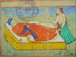 | Description / विवरण | A leaf of illustrated manuscript depicting a man lying on a bed and talking to a woman. This manuscript has 38 pages with 16 illustrations. |
