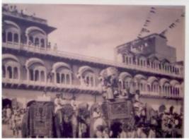 | Description / विवरण | It is a photograph of Royal procession in which elephants and royal servants are shown. The elephants are robed with the cloth. Some servants are holding flags. |