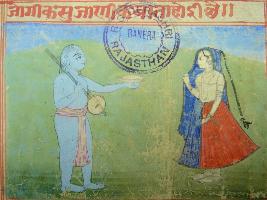 | Description / विवरण | A leaf of illustrated manuscript depicting a woman talking to a yogi. The manuscript has 38 pages with 16 illustrations. |