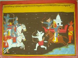 | Description / विवरण | Miniature painting based on Mahabharat - Vana parva depicting war between Chaturangi army and demon Salva. The arrow of Pradyuman destroys chariot of Salva. |