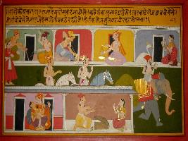 | Description / विवरण | Miniature painting based on Prithviraj Raso depicting passing through the town by seeing various activities like the working of goldsmith and many other kinds of buying and selling. |