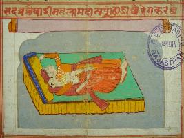 | Description / विवरण | A leaf of illustrated manuscript depicting one couple sleeping on a bed. This painting has 38 pages with 16 illustration. |