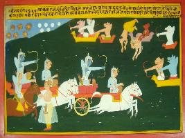 | Description / विवरण | Miniature painting based on Mahabharat - Vana parva depicting war between God and demons, Raja Yayati has been depicted taken away by demons. |