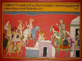 | Description / विवरण | Miniature painting based on Prithviraj Raso depicting Prithviraj meeting three lakh cavalry soldiers of king Jaichand. Poet Chandvardai is also with him. |