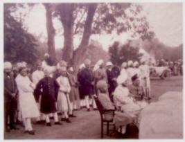 | Description / विवरण | In this photograph three people are sitting on a chair, one of them seems to be the king. In front of them, a table is shown. Besides this some people are standing with the gun stick, the sword is also shown. All are in the good dress. |