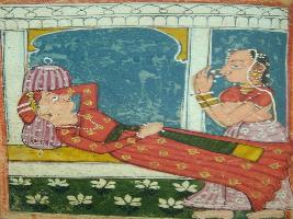 | Description / विवरण | A leaf of illustrated manuscript based on Sav linga ki chaupai depicting a man is lying on bed with masand and a female is standing beside him. It has 12 illustration. |