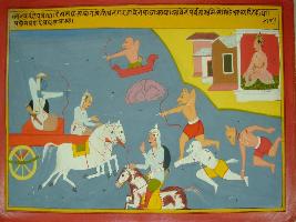 | Description / विवरण | Miniature painting based on Mahabharat - Vana parva. A war is depicted between demons and god. one king is depicted sitting in his palace. |