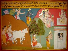 | Description / विवरण | Miniature painting based on Prithviraj Raso depicting poet Chandvardai telling the king that even Krishna had fled from Jarasandha once and Draupadi faced insult in Kaurava court and Janak himself ploughed the field and got Sita. |