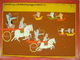 | Description / विवरण | Miniature painting based on Mahabharat - Vana parva depicting a war scene, Pradyuman is depicted fighting a war scene, Pradyuman is depicted fighting with the demons. Gods are depicted on chariot and demons on flying yaans. |
