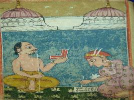 | Description / विवरण | A leaf of illustrated manuscript based on Sav linga ki chaupai depicting a man narrating something and his disciple writing that. This manuscript has 12 illustrations. |