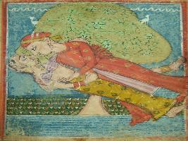 | Description / विवरण | A leaf of illustrated manuscript based on Sav linga ki chaupai depicting a couple lying on the ground under a tree near a river bank. This manuscript has 12 illustration. |