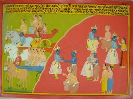| Description / विवरण | Miniature painting based on Mahabharat - Vana parva. It is depicting Krishna is telling Yudhisthir to move towards Kamyak vana. All the Pandavas reaches to Kamyak vana in sage Dhaunya s hermitage and touches his feet. Abhimanyu and Subhadra moves towards Dwarika and Draupadi towards her home lower with her brother Dhristadyumana. |