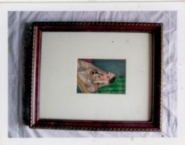 | Description / विवरण | Bust of a woman is depicted on gray ground and a green curtain at right side. She is sitting by a dark purple cushion Partly visible by left side with profuse jewelry in neck, ears and on forehead. She made nar naris is two parts and have on her shoulder in front side and her veil is transparent and a purple colour with golden border with red and blue designs between her blouse is a purple colour. |