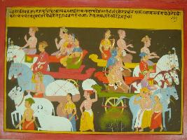 | Description / विवरण | Miniature painting based on Mahabharat - Vana parva depicting Yudhisthir and other Pandavas are moving towards Kamayak vana and all maids and servants are moving behind them with all fooding and lodging equipments. |