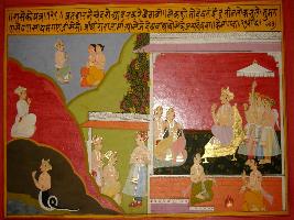 | Description / विवरण | Miniature painting based on Prithviraj Raso depicting Prithviraj seated in the court of Pratihar king and talking to him. |