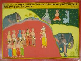| Description / विवरण | Miniature painting based on Mahabharat - Vana parva depicting Pandavas are moving towards Dwait vana with fire on head of Yudhisthir of Agnihotri yagna. In the forest they saw many sages performing penance. |