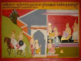 | Description / विवरण | Miniature painting based on Prithviraj Raso depicting Pratihar king talking to Chandvardai, in the meanwhile an attendant inform the king about the arrival king Jaichand. |