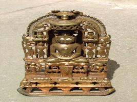 | Description / विवरण | It is a Brass image of Dharm Nath Jain Tirthankar . He is in padmasan posture. The symbol of thunderbolt is shown below his cushion. He is surrounded by human figures and two elephants. A chhatri is above his head. His eyes are inlaid with silver. The symbol of Shrivats is decorated with silver. |