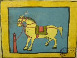 | Description / विवरण | Painting from illustrated manuscript - Shali hotra granth depicting a yellow coloured horse, tied in a pole the horse is depicted fully harnessed. This manuscript contains 24 pages and 35 illustrations. |