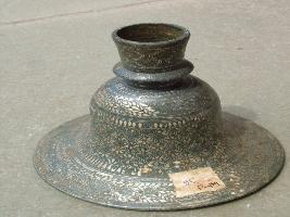 | Description / विवरण | It is base part of Hukka. It has a circular base in an inverted bell shape. It is decorated with inlay work of silver decoration having leaves and floral patterns. |