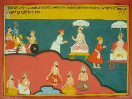 | Description / विवरण | Miniature painting based on Mahabharat - Vana parva depicting Markandaya is telling Yudhisthir about the story of Dasrath and exite of Ram. |