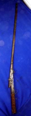 | Description / विवरण | Long, single barrel topidar percussion gun with metal barrel. The butt has ivory work and a hunter is hunting a tiger is painted on its both side. |