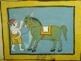 | Description / विवरण | Painting from illustrated manuscript - Shali hotra granth depicting a green coloured horse with a man holding its rope, the horse is depicted fully harnessed. This manuscript contains 24 pages and 35 illustrations. |