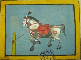 | Description / विवरण | Painting from illustrated manuscript - Shali hotra granth depicting a white coloured horse tied to a pole, it is highly decorated. This manuscript contains 24 pages and 35 illustrations. |