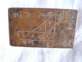 | Description / विवरण | A copper plate, having mantra inscribed in geometric form, with symbolic numerals and Devnagari alphabets, showing, it is devoted to Lord Hanuman. |