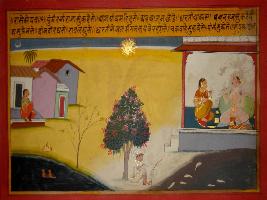 | Description / विवरण | Miniature painting based on Prithviraj Raso depicting and queen in upper left corner where queen is describing to the king about summer season when people resting under the trees and fishes are in trouble due to the hotness of water. |