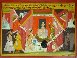 | Description / विवरण | Miniature painting based on Prithviraj Raso depicting camp of Prithviraj on the bank of river Yamuna depicting Savant talking of Madhu Shah and telling him that they will cross the river in boat after some time. |