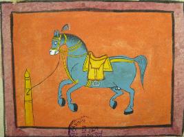 | Description / विवरण | Painting from illustrated manuscript - Shali hotra granth depicting a blue coloured horse tied in a pole and is fully harnessed. This manuscript contains 24 pages and 35 illustrations. |