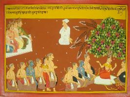 | Description / विवरण | Miniature painting based on Mahabharat - Vana parva depicting Pandavas are sitting together in evening and Draupadi is saying that Duryodahn in sinner and he should be punished for sin. |
