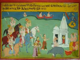 | Description / विवरण | Miniature painting based on Prithviraj Raso depicting a scene of buffalo sacrifice near the temple, above it Devta also depicted, king and his army is also seen on the left hand side of the painting. |
