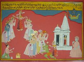 | Description / विवरण | Miniature painting based on Prithviraj Raso depicting goddess Bhavani s temple and her fight with a demon in front of her temple. On the left side of the painting a sage is doing yagna and above it goddess Bhavani is seen with a sword in her one hand and king and other person take blessings from her. |
