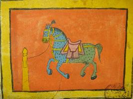 | Description / विवरण | Painting from illustrated manuscript - Shali hotra granth depicting a horse blue and green coloured with dots all over the body, it is tied in a pole and is fully harnessed. This manuscript contains 24 pages and 35 illustrations. |