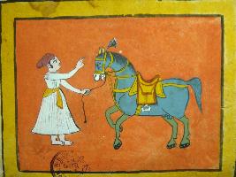| Description / विवरण | Painting from illustrated manuscript - Shali hotra granth depicting a man holding the rope of a horse, the colour of the horse is blue and is fully harnessed. This manuscript contains 24 pages and 35 illustrations. |