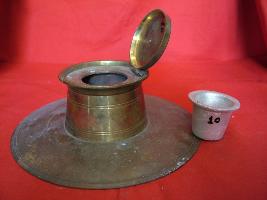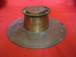| Description / विवरण | It is an inkpot with flat and circular base and a cylindrical body with a lid, fixed by a clamp. The ink container is fixed by a groove. |