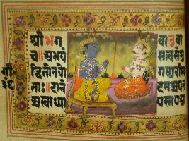 | Description / विवरण | A leaf of illustrated manuscript based on Bhagwat Gita depicting Krishna preaching Arjun. This manuscript has illustration on 26 pages. |