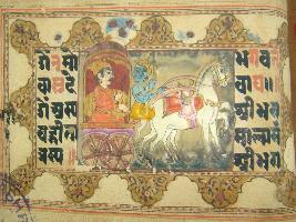 | Description / विवरण | A leaf of illustrated manuscript based on Bhagwat Gita depicting Krishna preaching Arjun. This manuscript has illustrations on 26 pages. |