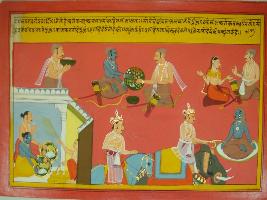 | Description / विवरण | Miniature painting based on Mahabharat - Vana parva depicting Pandavas are getting prepared for war with Kauravas and Duryodhan is depicted moving on elephant back. |