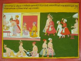| Description / विवरण | Miniature painting based on Mahabharat - Vana parva depicting Draupadi is telling king that servant should be punished if he doesn t take order of king. Servants both male and female, and son should take order of king. |