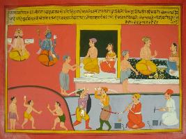| Description / विवरण | Miniature painting based on Mahabharat - Vana parva depicting Draupadi is telling king about man who doesn t show mercy. That type of man himself is house of sin. His friends would get angry with him and protest against him. His wealth would get lost. even his life woiuld be in danger. In the painting, one boy is shown throwning stone other boys at the lower right part. To its left, two men is shown fighting. to them left, black smiths are shown warking. At upper left part man is shown talking to his wife. and outside a begger is depicted. To their right, man is giving alms to begger with his wife sitting near him. At the upper right part, Vishnu and Brahma are shown sitting. |