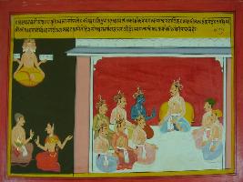 | Description / विवरण | Miniature painting based on Mahabharat - Vana parva depicting conversation between Yudhisthir and Drapadi at the lower right part. At the left part, Yudhisthir is shown sitting with his brothers and minister. At the upper right part, Brahma is depicted. |